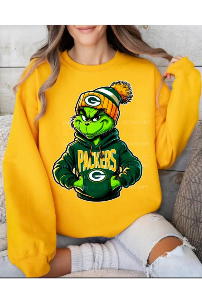 A woman is wearing a yellow sweatshirt with a cartoon image of the Grinch wearing a Green Bay Packers hoodie and a beanie. The Grinch's hoodie has the word "PACKERS" and the Packers "G" logo on it, and the beanie also has the "G" logo.